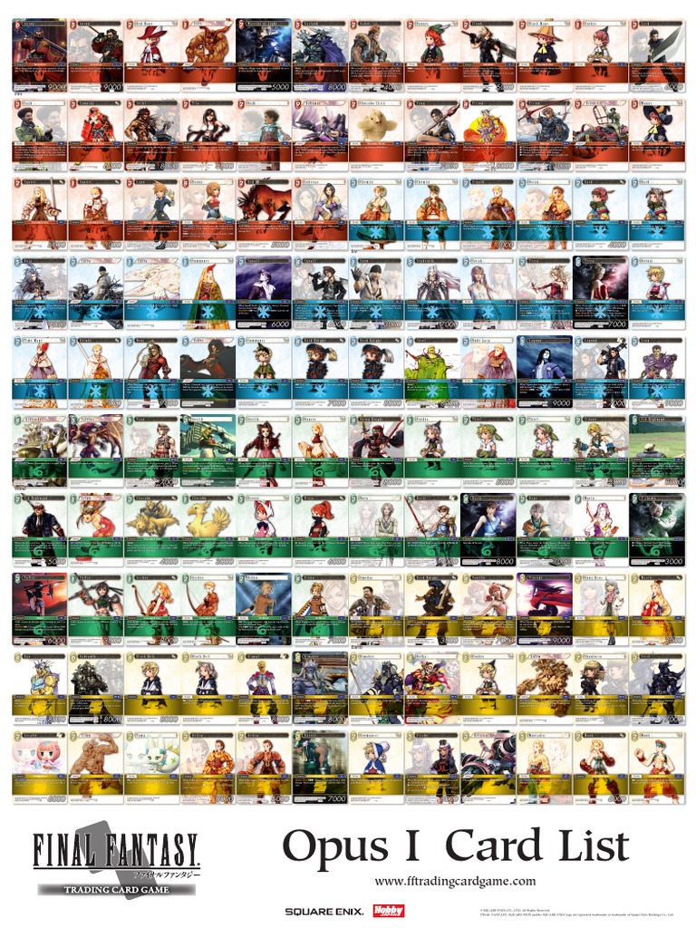 The main sets focus on final fantasy vii final fantasy x and final fantasy xiii. The cards are from various final fantasy titles. The opus 1 collection contains 186 non foil cards and 216 special foil premium cards. The following is a list of cards from the final fantasy trading card game.
